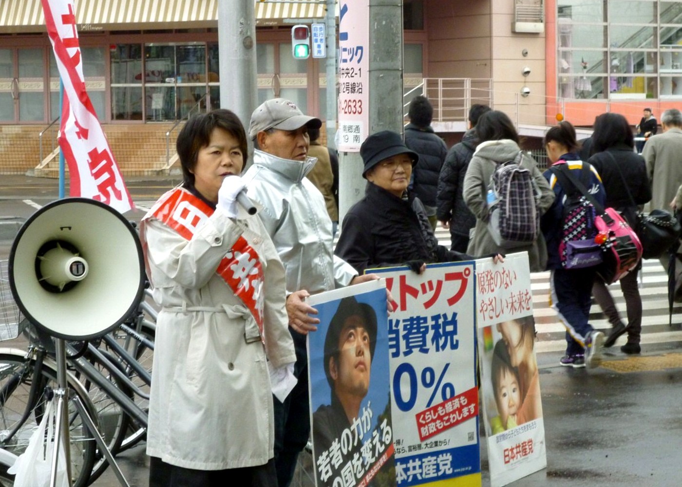 日本共産党清田区後援会と吉岡ひろ子党清田区市政相談室長は24日朝、地下鉄南郷18丁目駅で定例宣伝を行いました。後援会員ら6人が参加し、吉岡さんが原発とTPP問題で訴えました。