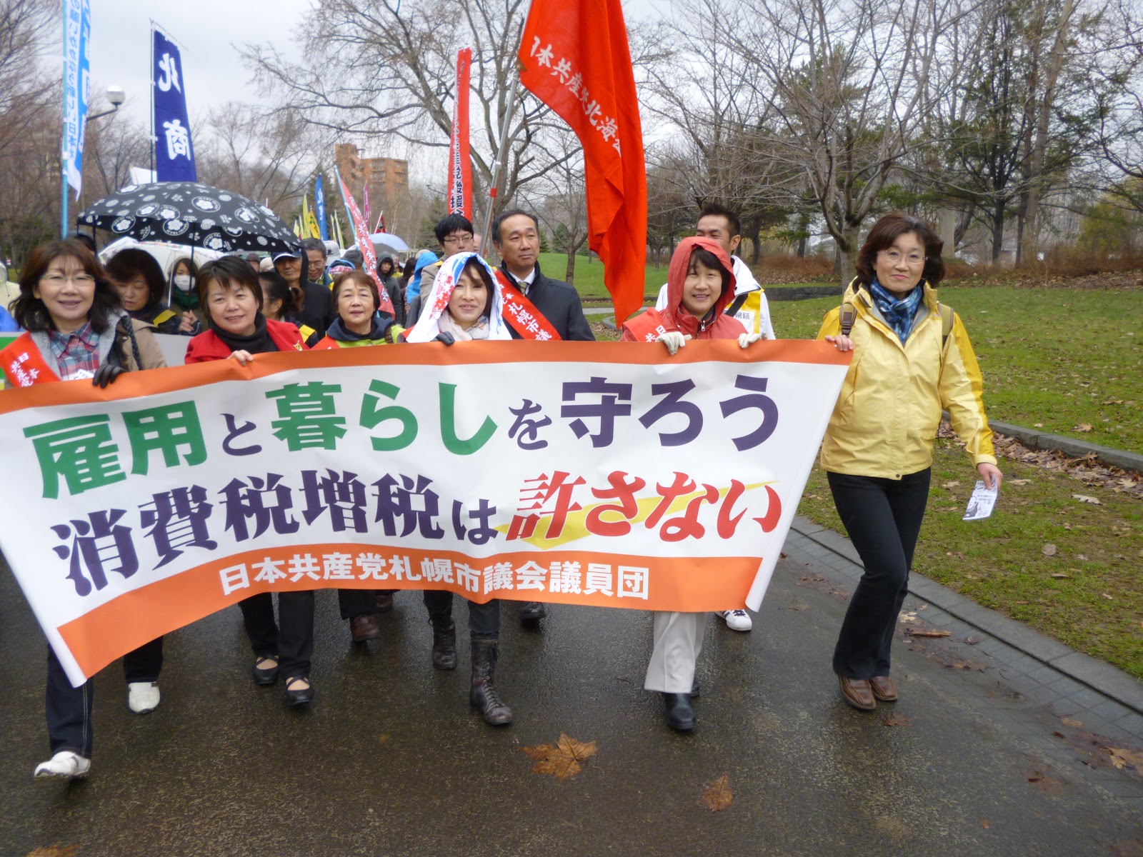 北海道労働組合総連合(道労連)の黒澤幸一議長は「安倍政権は原発再稼働、TPP参加、消費税増税、生活保護削減、教育改悪、憲法改悪を一気に進めようとしています。労働者・国民の大同団結で立ち向かおう」とあいさつし、日本共産党の紙智子参院議員と森つねと参院北海道選挙区候補が壇上で連帯のあいさつをしました。