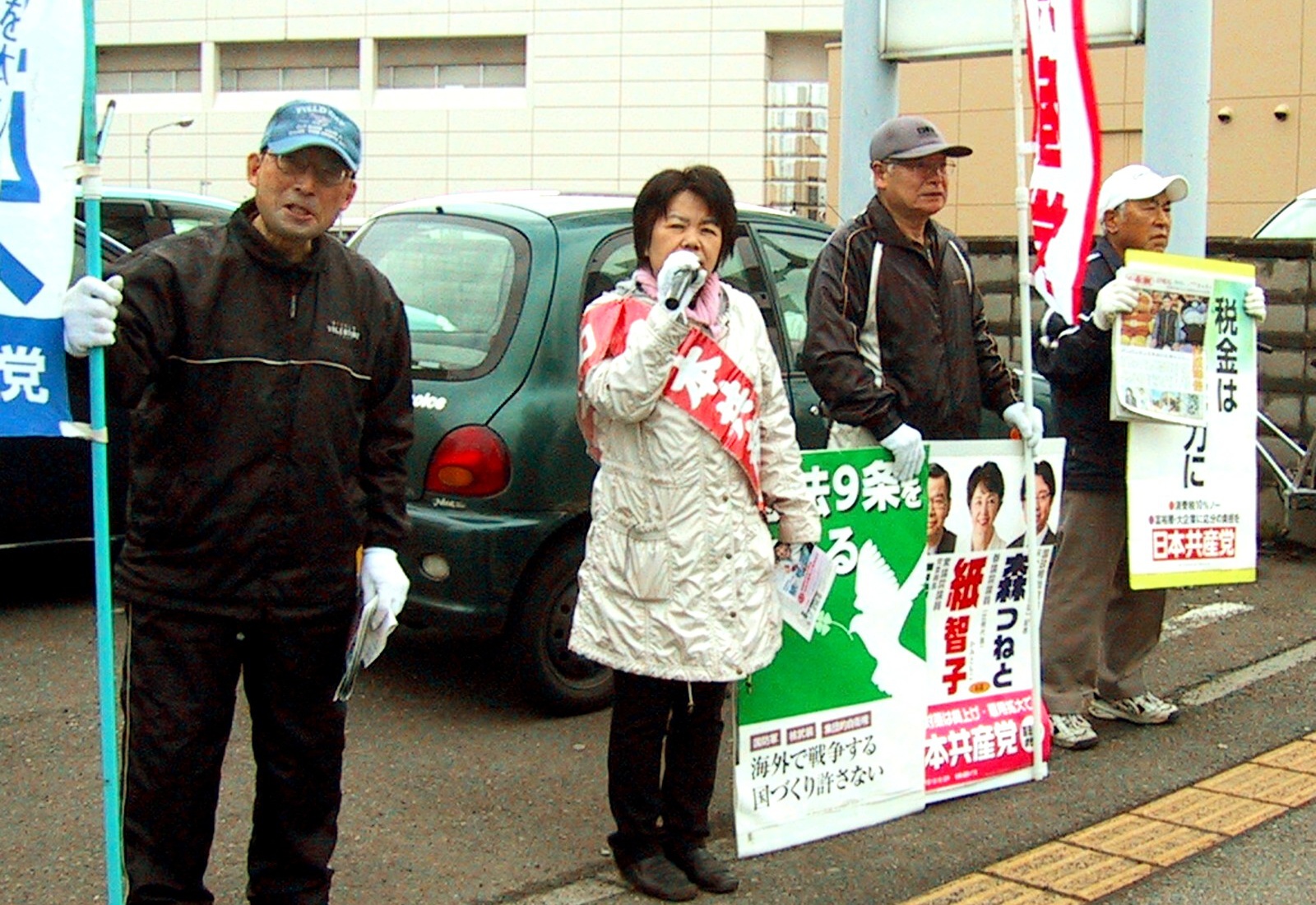 清田区の日本共産党後援会と吉岡ひろ子党清田区市政相談室長は7日朝、真栄バス停前で定例の街頭宣伝を行いました。(写真)