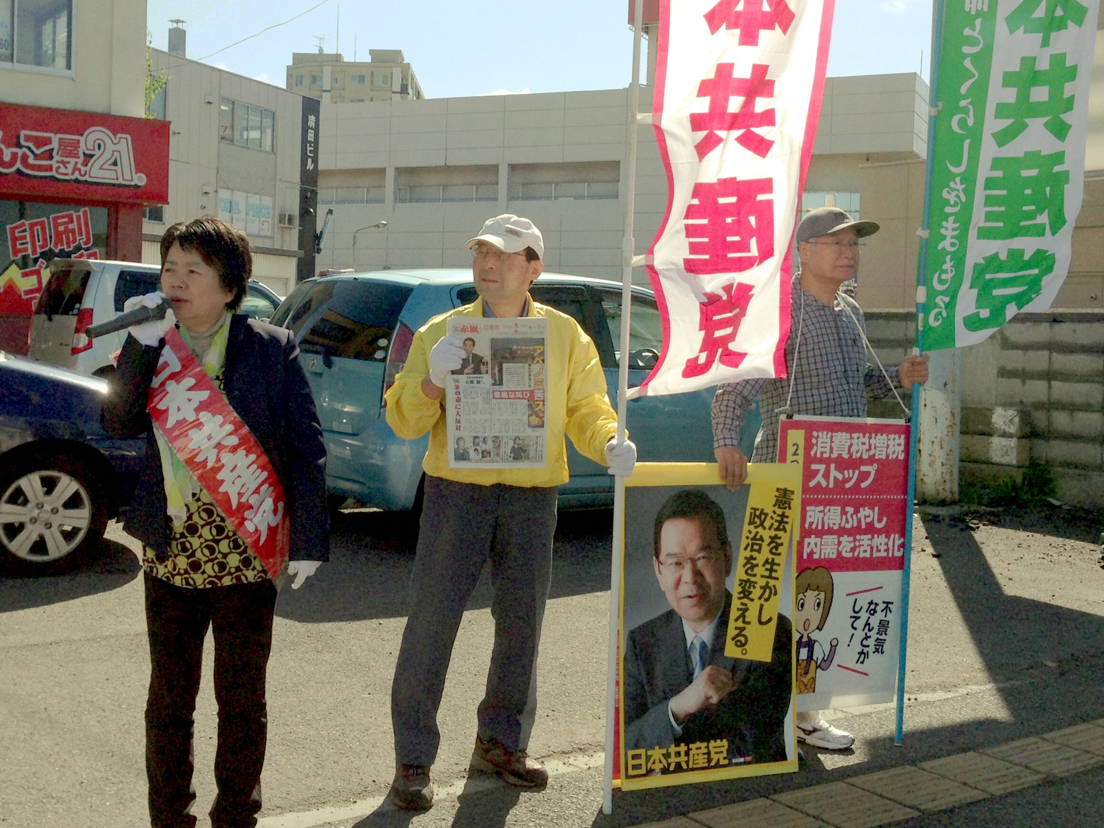 4日朝、清田区の日本共産党後援会と吉岡ひろ子党清田区市政相談室長は国道36号線沿いの北海道銀行横で通勤客らに街頭宣伝を行い、後援会員ら5人が参加しました。