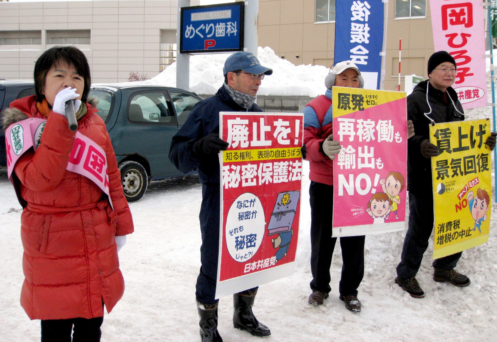 吉岡さん、後援会の松崎さんがハンドマイクで演説。秘密保護法成立強行、辺野古への米軍新基地建設の推進、原発再稼働、靖国神社参拝、増税・社会福祉破壊など、安倍政権の「戦争する国づくり」への暴走を批判、平和と民主主義・生活を守るため国民と手を携えてがんばる日本共産党へのひきつづく支持・支援を訴えました。